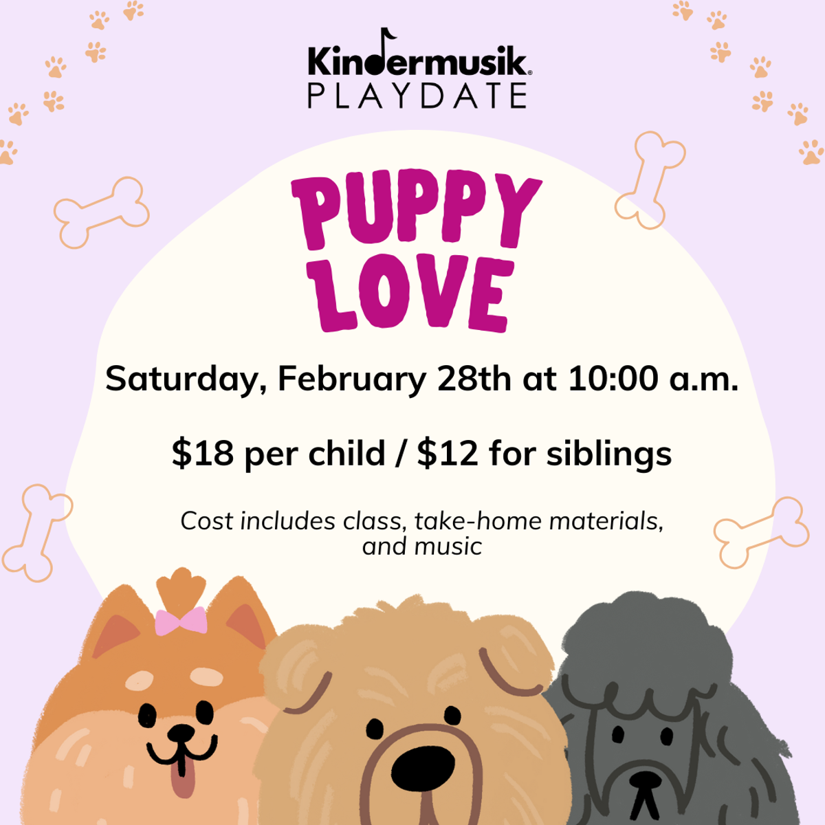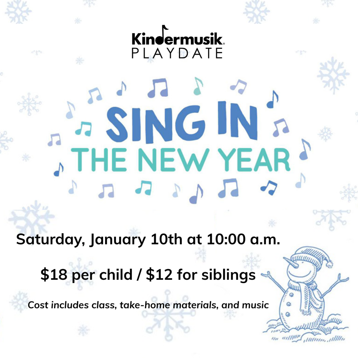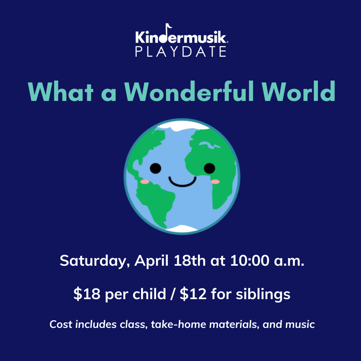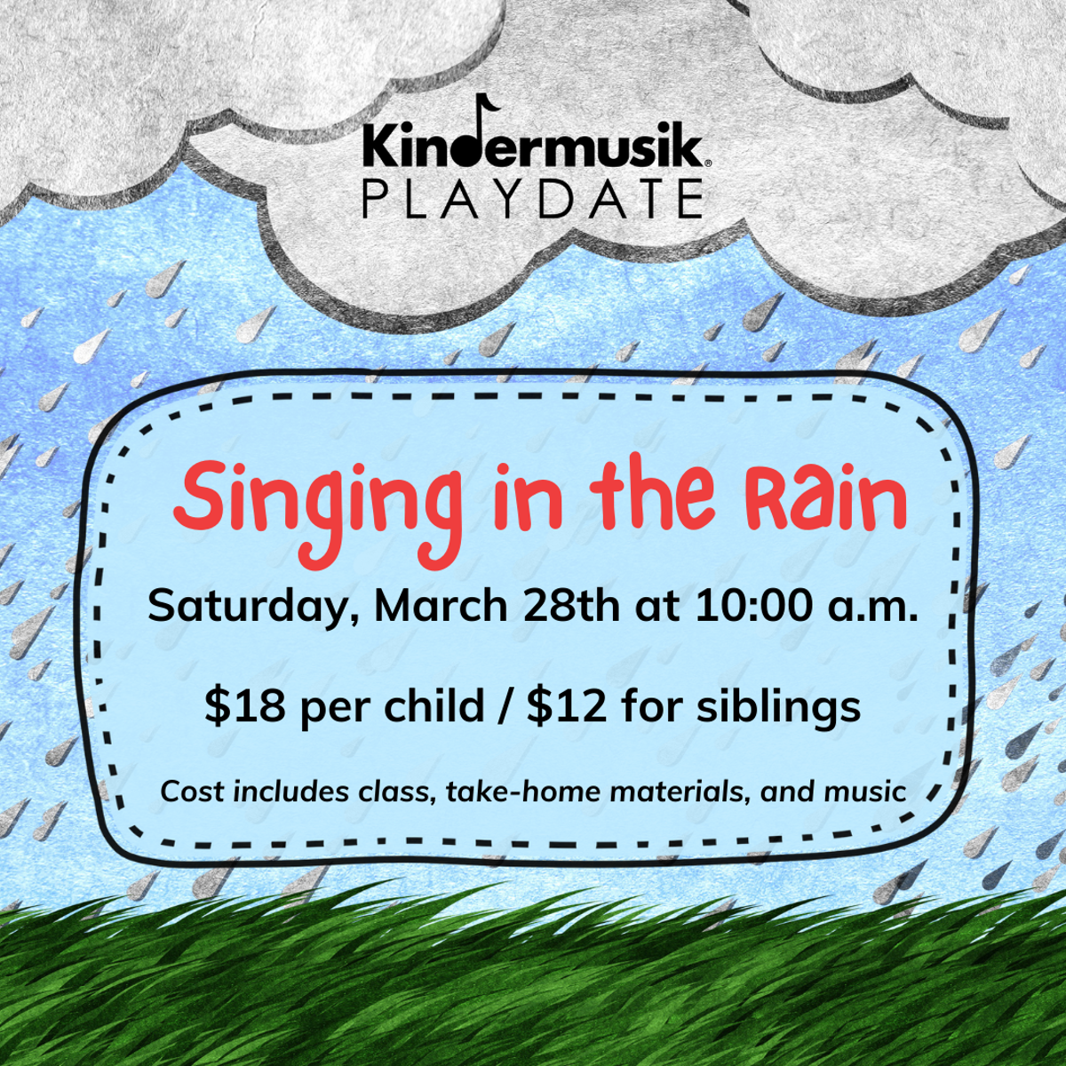 Playdates are centered around a theme. Playdates are for children ages 0-5 years and parent(s)/caregiver! (Families with multiple children are invited to bring a parent/caregiver for each child.) Playdates include music and developmentally appropriate activities for each child. At the end of the Playdate, each household receives age-appropriate instrument/prop and digital music to continue the Kindermusik® play after the class has ended.